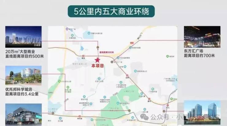 项目北面约500米配建一个20万平方的大型综合体,相当于万菱汇,项目自配建1.8万方的风情商业街,周边5公里范围内还有萝岗万达、奥园广场、天河万科广场,项目东面还有一个东方汇广场,步行约700米,就有电影院、超市和肉菜市场,及诸多美食店,也是基本的中低端消费,满足生活必需还是不错的。