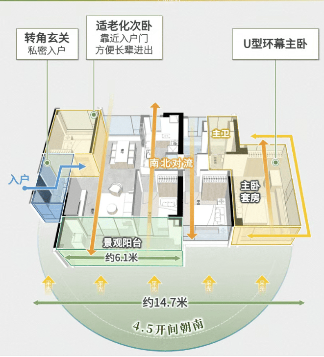 南向约14.7米、4.5个开间的布局,三面环幕,通透敞亮。