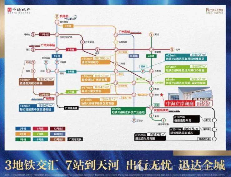 3.地铁线路(4号线、3号线东延段、8号线规划中):项目邻近地铁站“海傍站”,4号线现已开通,同时接通3号线东延段,12分钟到达番禺广场,35分钟到达市区中心地带;而8号线南延段(规划)从海傍站22分钟直达万胜围到达琶洲;