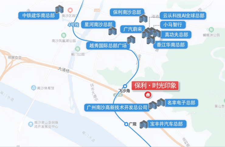 地铁:距离飞沙角/广隆地铁站直线距离900米,家门口双地铁站,一站到金州,两站到蕉门换乘22号线接驳3/18号线,连接庆盛枢纽,约50分钟到琶洲/金融城CBD,未来规划4条地铁线汇聚(4号线/15/22/38号线)