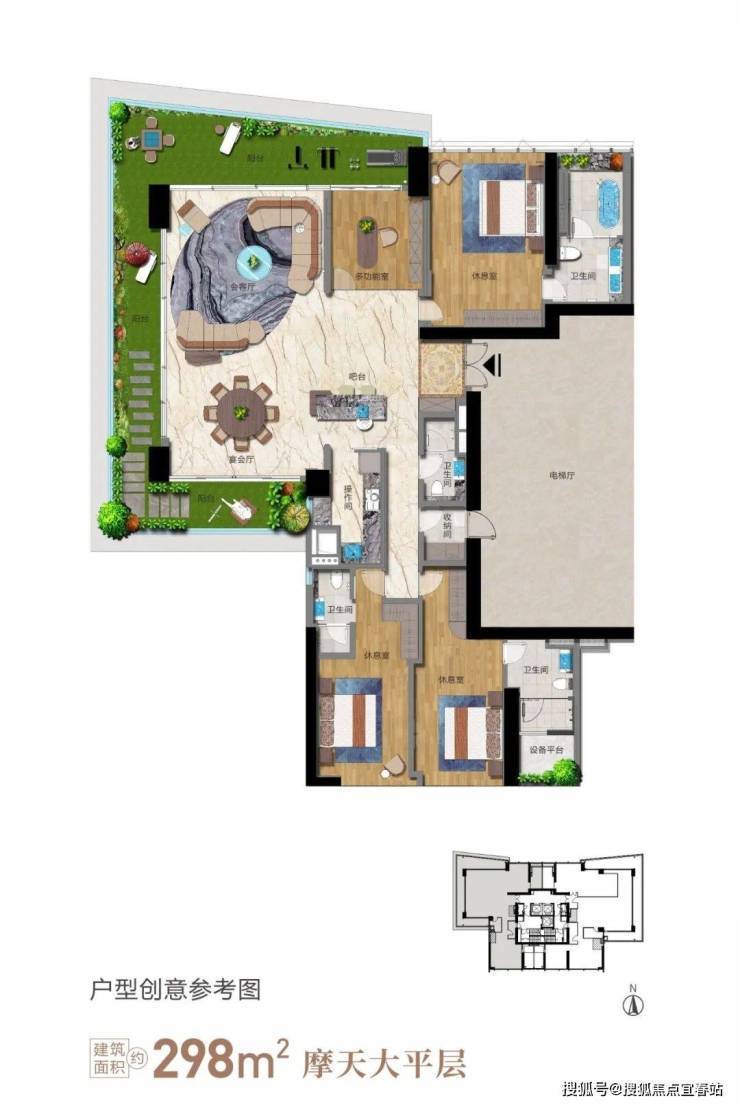 天銮建面约298-708㎡纯粹大平层,双创U型跑道式阳台、320°摩天庭院、全屋落地玻璃设计,迭新高端奢宅体验。