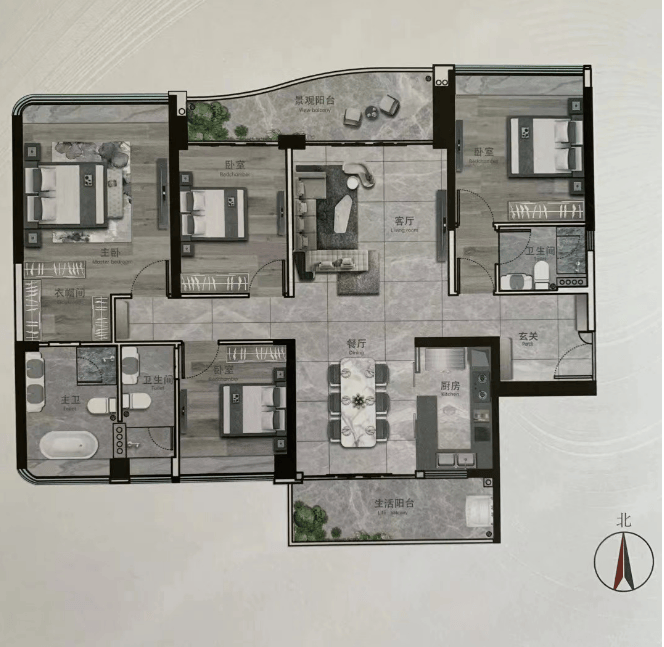 搭配着代表现代人居新潮流的板式结构,将户型一字排开,用大面宽设计,带来无遮挡的超大采光面,赋予居住空间温暖、舒适、健康的属性。