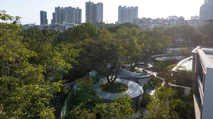 蜿蜒起伏的林间小径,连接其高低不一的环形浮岛,浮岛中央生出挺拔的古榕树,浮岛之下又别有天地,度假感油然而生。