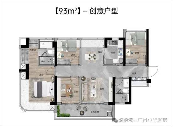 【93㎡四房两厅两卫】:东南向,使用率109%,独立入户玄关,南北通透,四面宽极致视野,主卧270°主卧弧形玻璃幕窗。