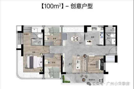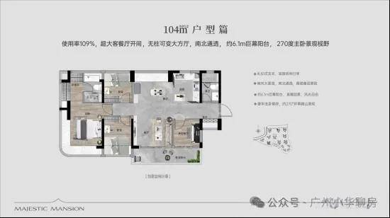 【100㎡四房两厅两卫】:西南向,使用率109%,南北通透,约6.1米巨幕阳台,主卧270°主卧弧形玻璃幕窗。