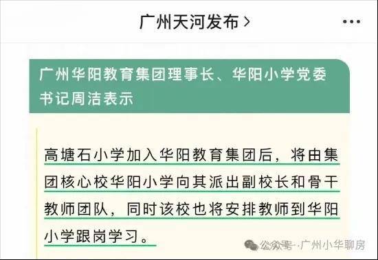 天河政府官微已在去年官宣该校加入华阳教育集团,并由原华阳小学向其派出副校长和骨干教师团队进驻,相当于拥有纯净“华阳系”血统。