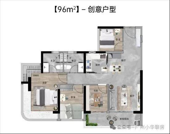 【96㎡四房两厅两卫】:西南向,使用率100%,约5.7米面宽瞰山阳台,主卧270°主卧弧形玻璃幕窗。