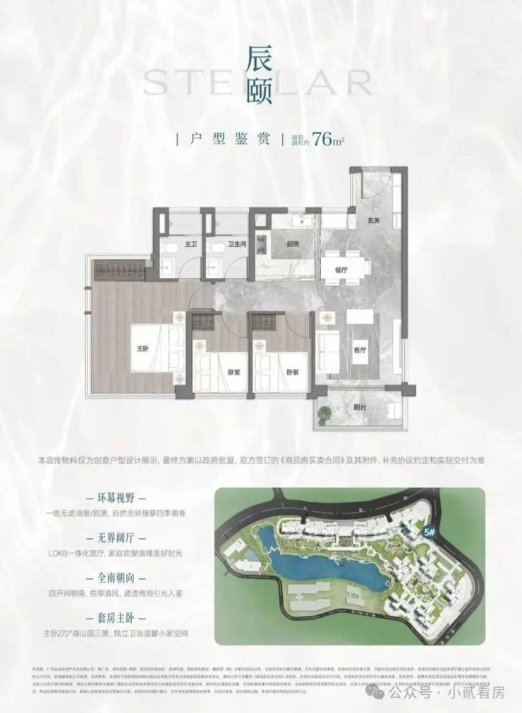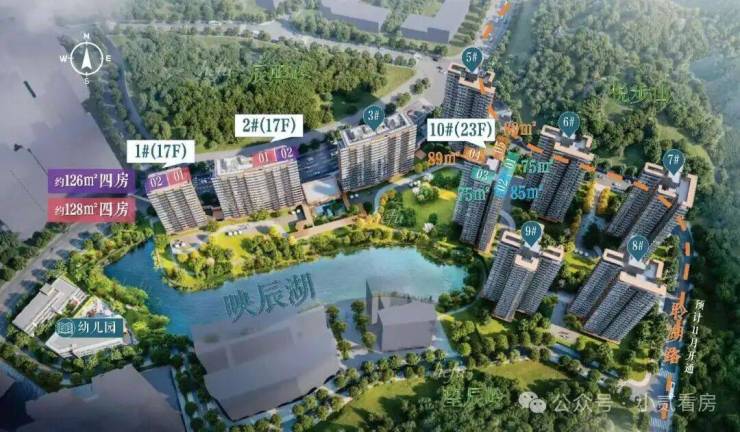 据悉,项目首推户型为建面约73-88㎡三房,住宅全南向布局,板楼可南向一线望映辰湖。