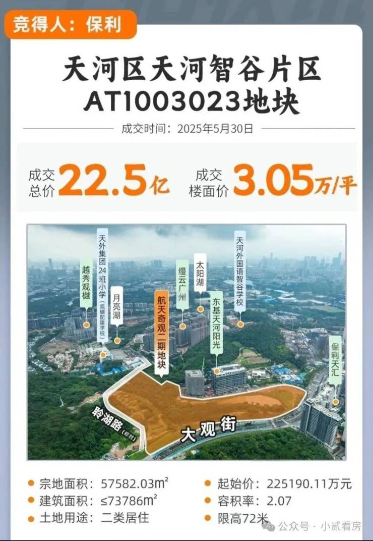 2025年5月30号,保利发展以22.5亿总价拿下天河航天奇观二期(智谷片区AT1003023地块),名义楼面价约为3.05万元/平。