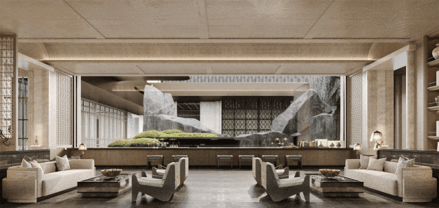使用岭南园林「藏水于庭」的技法,在这里打造了一座立体花园,既承浣红跨绿之韵,又化山野飞瀑为庭中景。