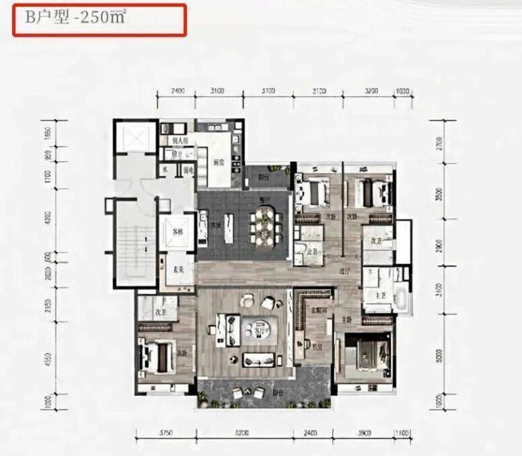 250㎡六房户型全户型南北对流,比起200㎡的户型,它的生活阳台较小,但设置了佣人房和西厨区,客厅的开间也更大,达到了6.2米。靠近主卧的书房也可以打通纳入房间。