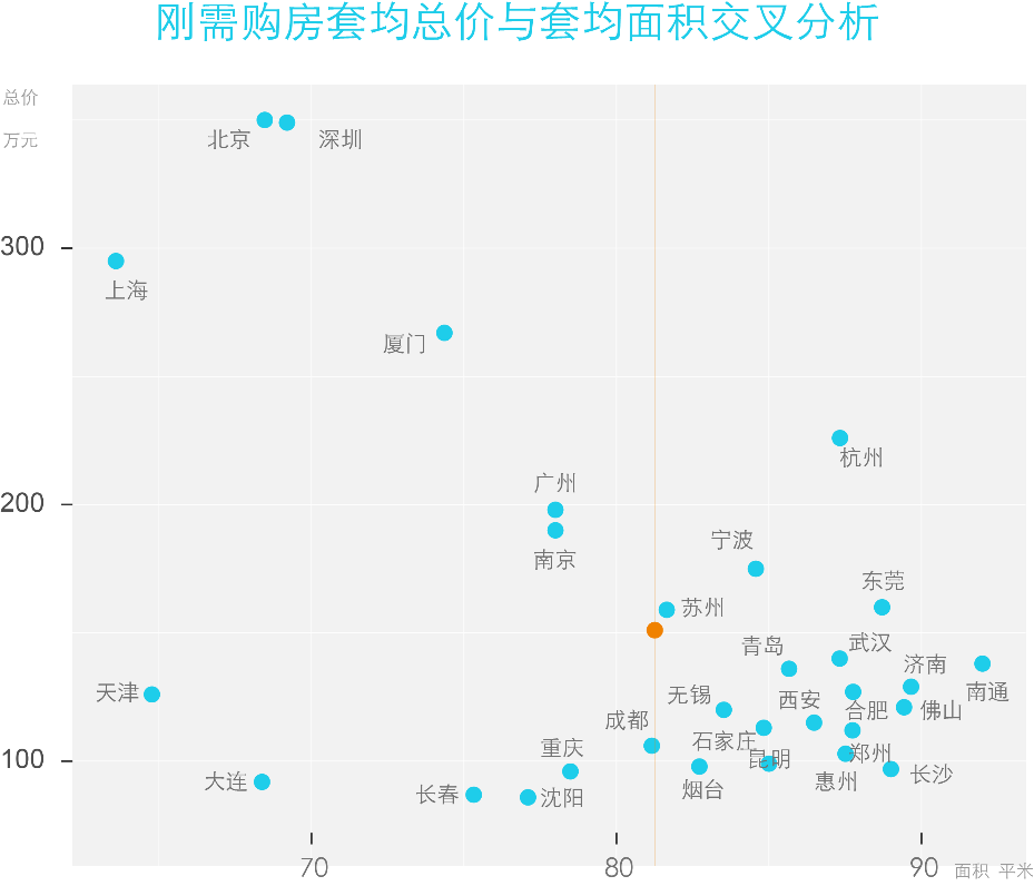 此外,报告显示,“高房价城市”才有典型的“刚需人群”。在30个样本城市中,北京、深圳、厦门、杭州等高房价城市,刚需上车均价显著偏离整个市场交易均价。其中,北京刚需客户置业套均总价比全市成交套均价低77万元,深圳低63万元。