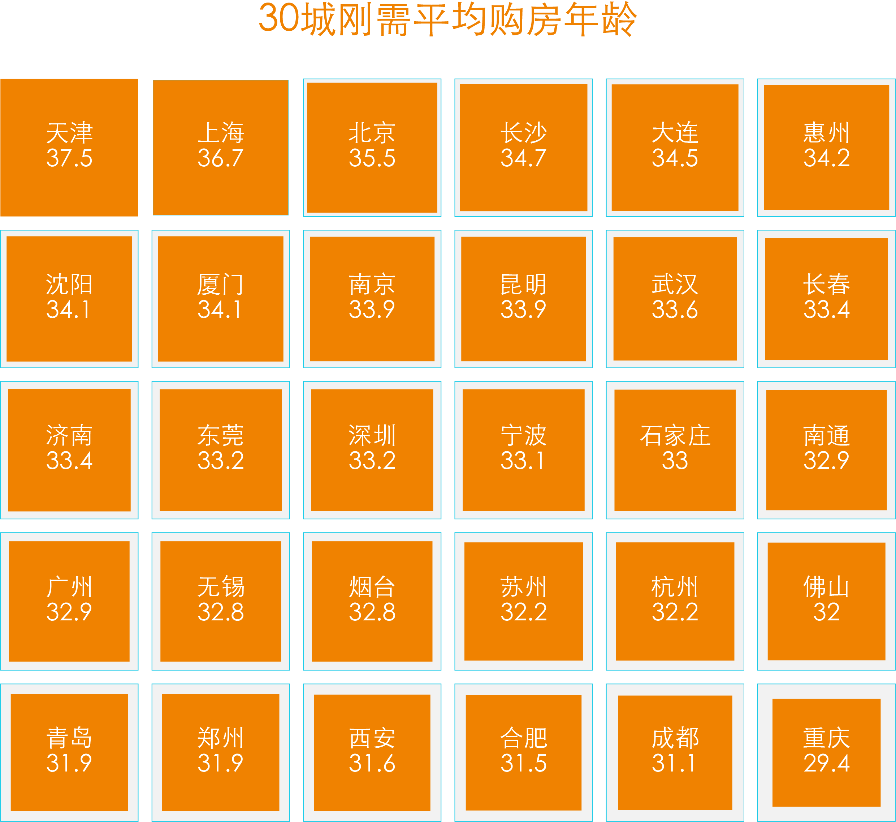 以购房年龄较大的天津为例,刚需购房平均约37.5岁,而天津整体平均购房年龄在35.4岁。与之相对的,重庆、成都、合肥、西安、郑州等新一线城市的刚需平均购房年龄相对较低,其中重庆刚需购房年龄较低,约为29.4岁。